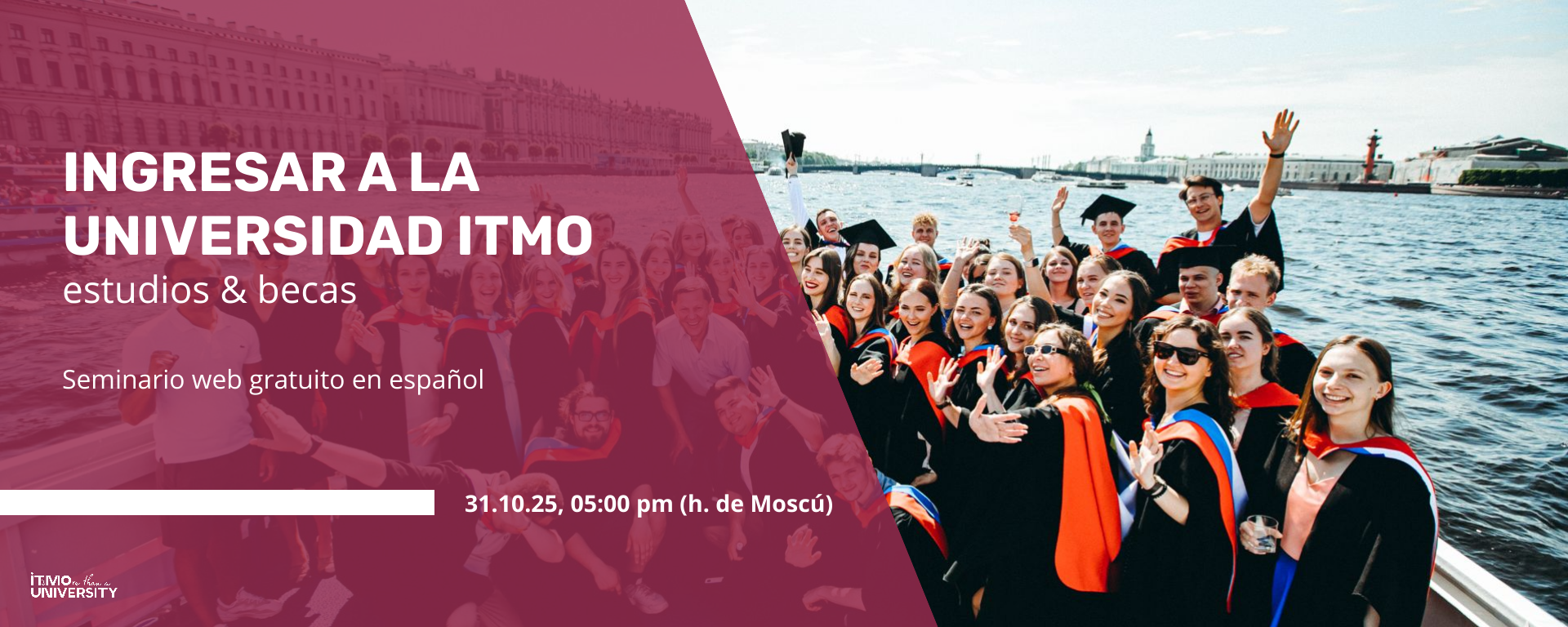 Te invitamos a nuestro webinar gratuito dedicado a la postulación a la Universidad ITMO. El 31 de octubre (viernes) a las 17:00 (h. de Moscú) via Zoom junto con el representante de rectorado, Aleksei Lizunov, y manager del departamento internacional, Daria Kushnereva, te explicamos paso a paso el proceso de postulación a la Universidad ITMO, así como presentamos las carreras de pregrado y posgrado, relatamos más sobre el costo de la vida en San Petersburgo, brindamos consejos útiles, contestamos a todas las preguntas en directo y también explicamos ¡cómo se puede obtener la beca para estudiar en una de las mejores universidades rusas gratis!